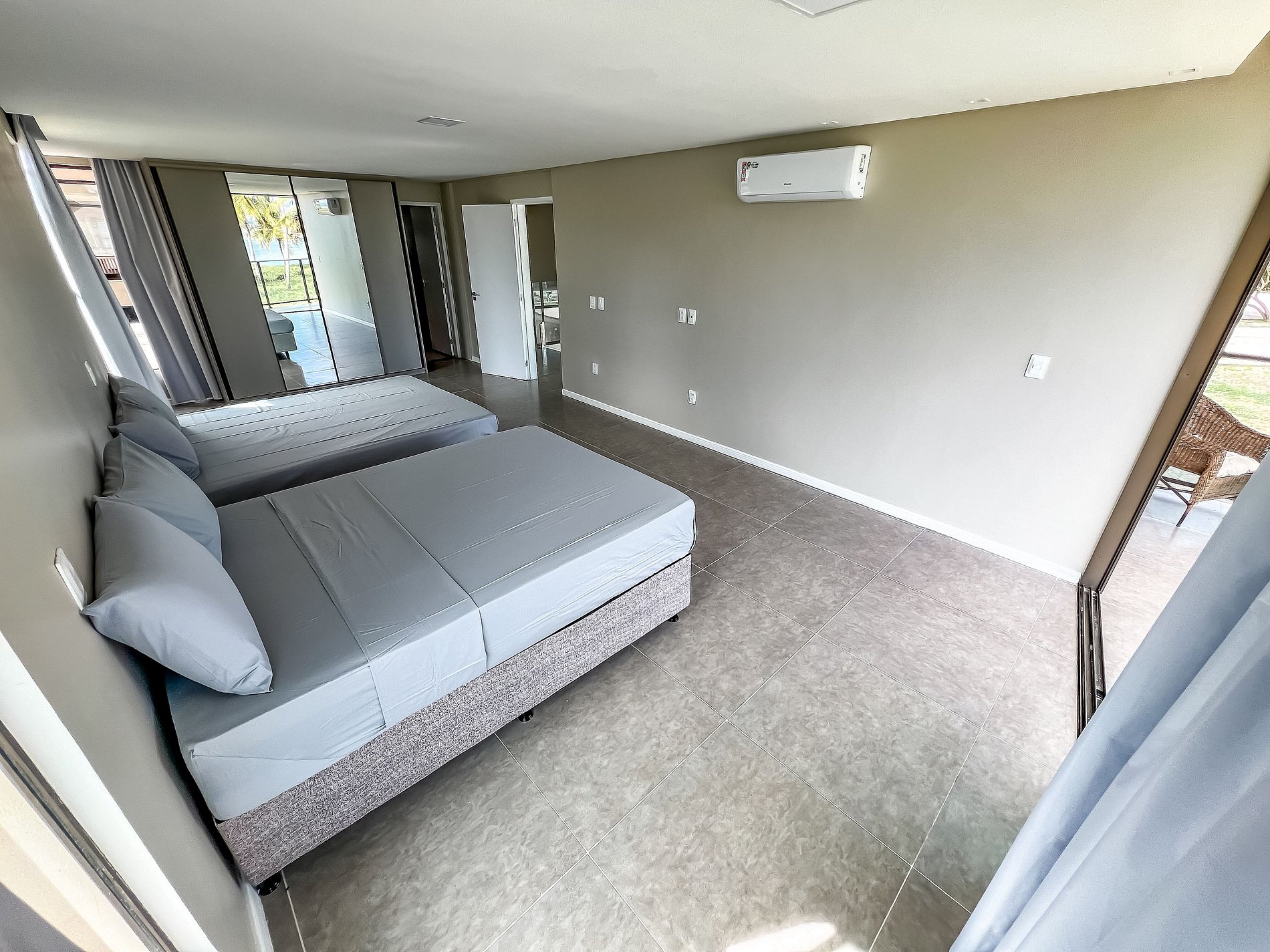 Suíte Master: uma cama queen e uma cama de casal com VISTA PRA O MAR e varanda.