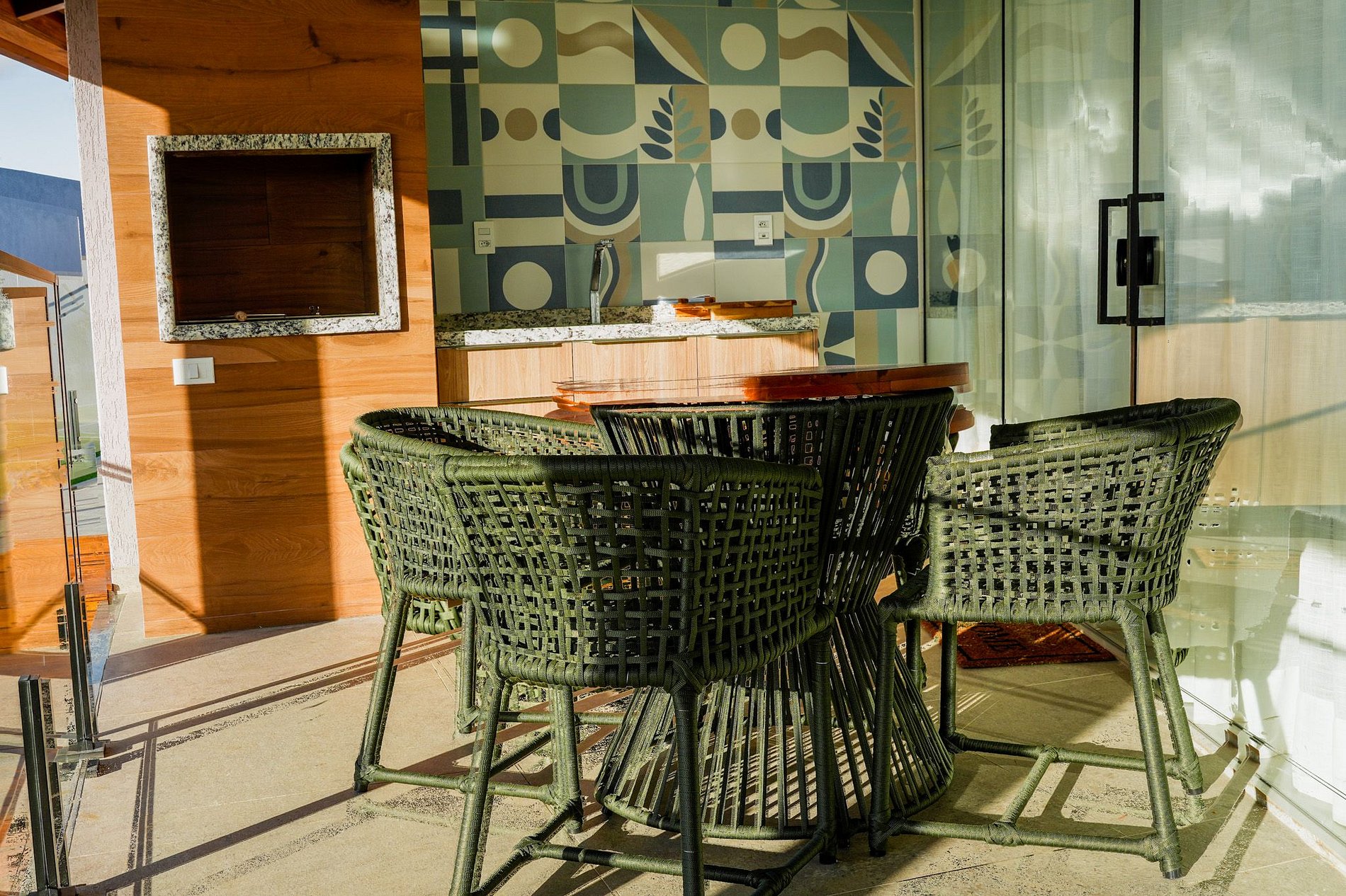 A suíte principal ainda conta com rede na varanda para descansar. A sala de estar possui vista para o mar e para piscina. A área Goumert é climatizada, aconchegante e bem decorada com o tema praia. A cozinha é integrada com churrasqueira e a área gourmet.