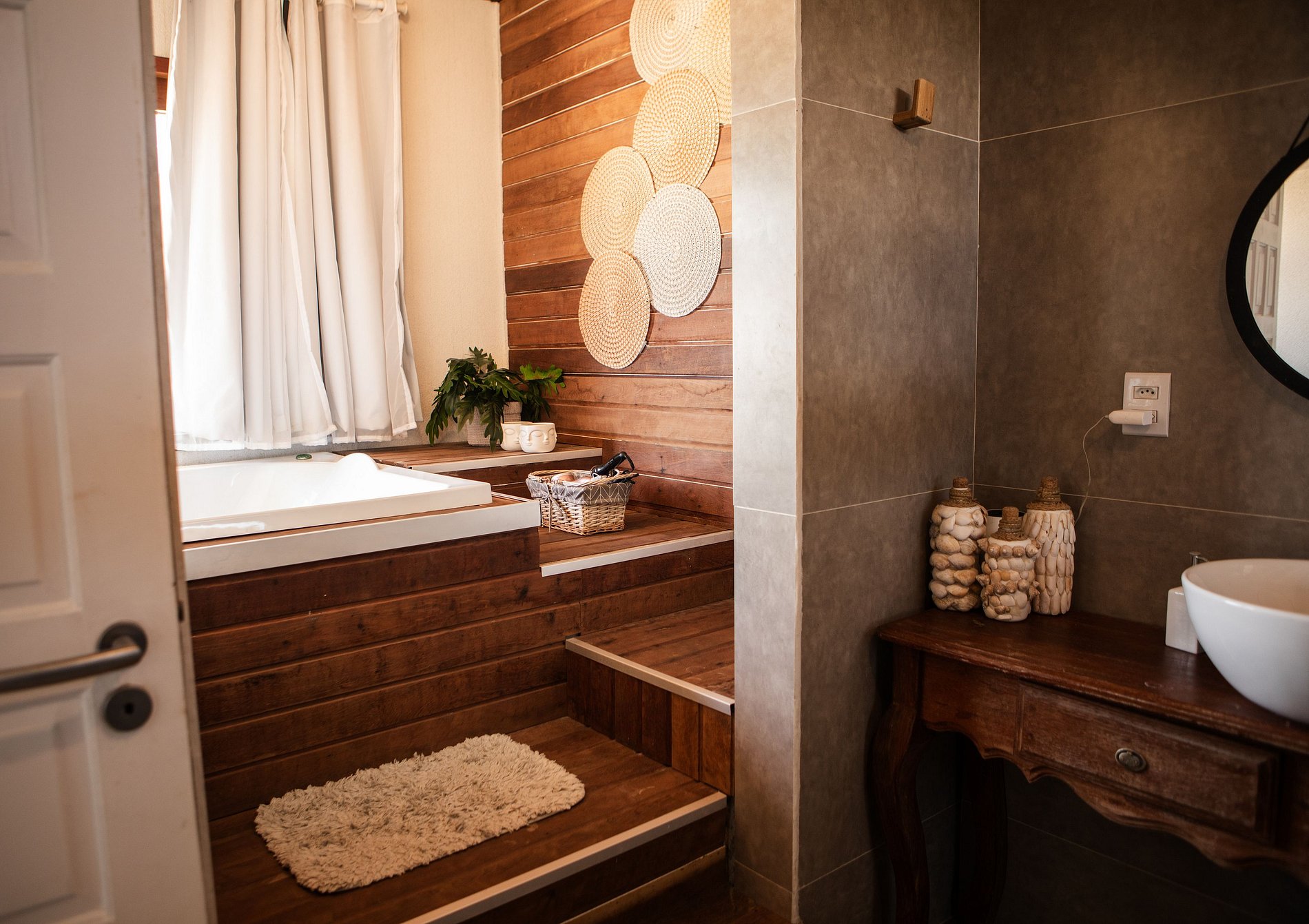 -Suíte Master: cama King + 2 colchões, comporta até 4 pessoas. Banheiro com banheira de hidromassagem e vista para o mar.