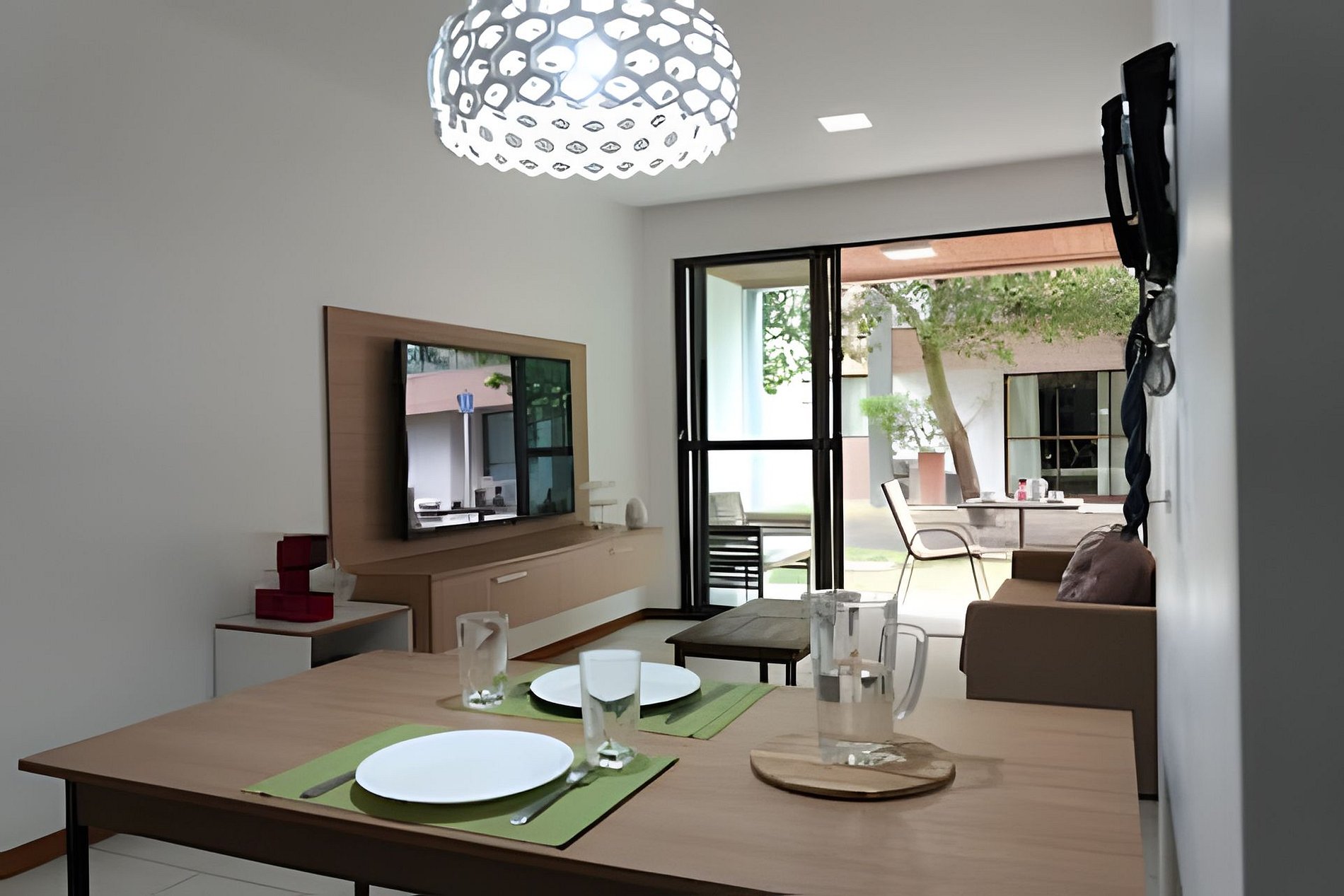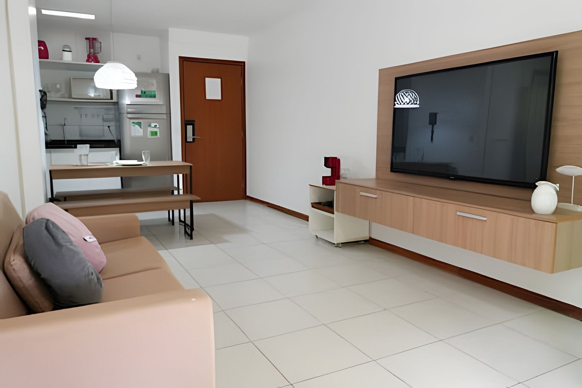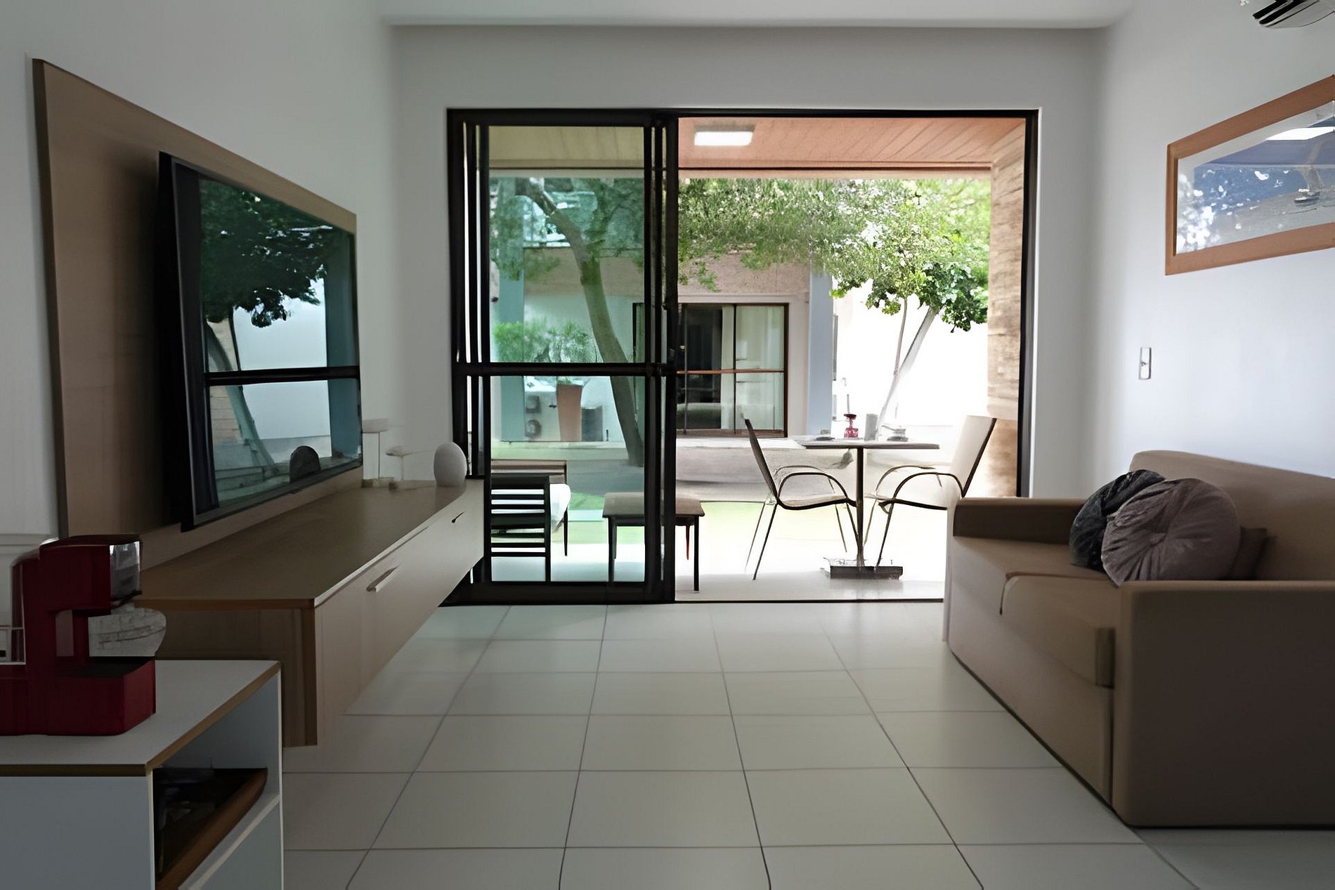 - Apartamento térreo com 2 quartos com ar condicionado, sendo 1 suíte; Sala com ar-condicionado; Cozinha completa integrada e varanda.